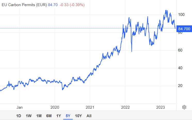 Cena emisních povolenek vzrostla v únoru na nový rekord a překonala 100 eur za tunu CO2. V současnosti je jejich cena kolem 85 eur, evropští politici by si ale přáli, aby jejich cena dlouhodobě vzrostla. Emisní povolenky se proto budou postupně stahovat, čímž klesne jejich nabídka a ceny porostou. Již příští rok si elektrárny budou muset zvyknout na nový normál emisních povolenek, jejichž cena bude nad 100 eur. Ještě v roce 2019 přitom jejich cena dosahovala kolem 20–25 eur za MWh.