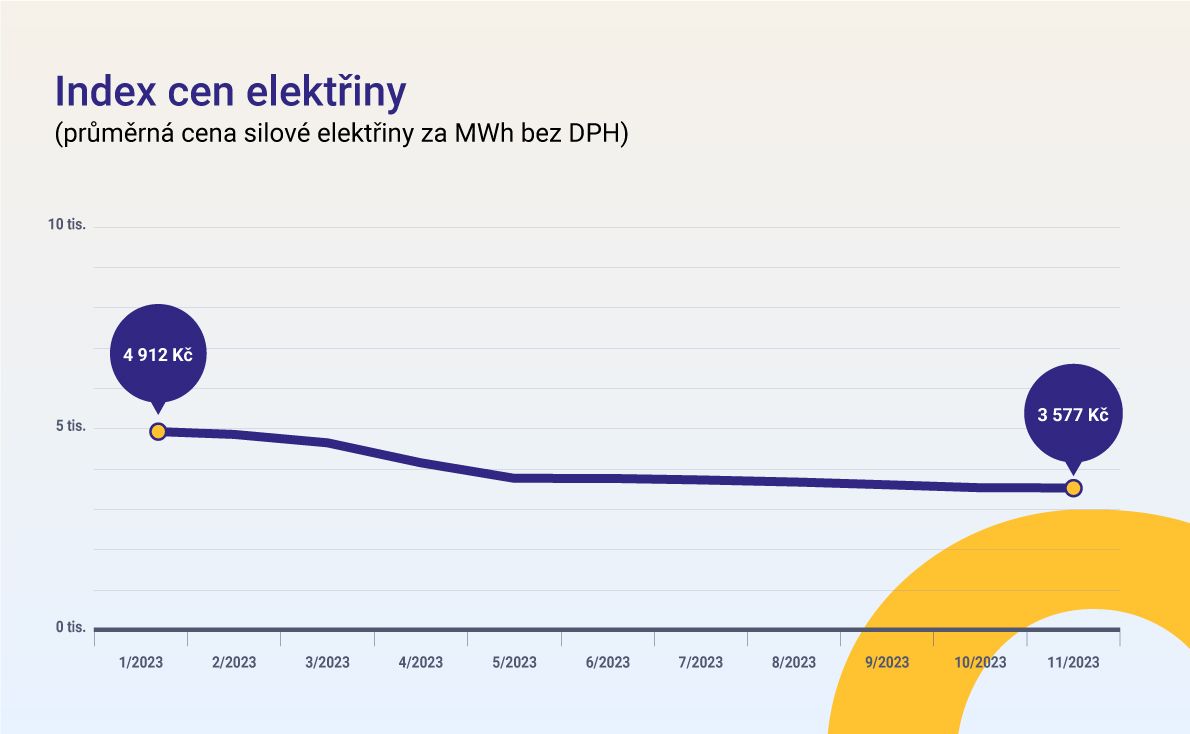 Byť cena elektřiny na burze prudce klesala, u dodavatelů se to projevovalo jen částečně. I tak bylo možné získat atraktivní nabídky při fixaci na 2 nebo 3 roky. Podle indexu silové elektřiny Ušetřeno.cz, který vychází z uzavřených cen u 7 nejvíce uzavíraných dodavatelů, cena silové elektřiny u dodavatelů pozvolna v roce 2023 klesala a dostala se na úroveň kolem 3,5 Kč za kWh bez DPH.