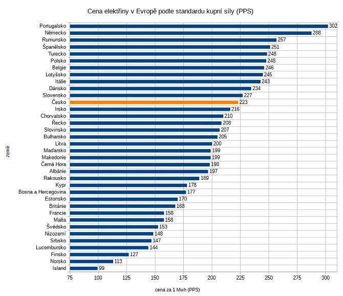 Čím víc cena elektřiny uvedená v PPS roste, tím více spotřebitelských statků se lidé musí vzdát, aby zaplatili svůj účet za energii. Zatímco české domácnosti vydají za průměrnou spotřebu proudu 223 PPS, obyvatelé Norska na pokrytí výdajů za elektřinu obětují jen polovinu zboží a služeb (113 PPS) a lidé žijící na Islandu dokonce ještě méně (99 PPS).