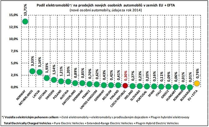 Na českých silnicích začalo v minulém roce jezdit 558 nových vozů na elektrický nebo hybridní pohon. Podle údajů Evropské asociace výrobců automobilů (ACEA) u nás prodeje elektromobilů oproti roku 2013 stouply o necelou čtvrtinu (23 %). V jiných koutech Evropy se ale daří prodávat elektromobily ještě rychleji. V zemích EU a EFTA (Norsko, Švýcarsko, Lichtenštejnsko a Island) se prodeje zvedly dokonce o 50,28 %.