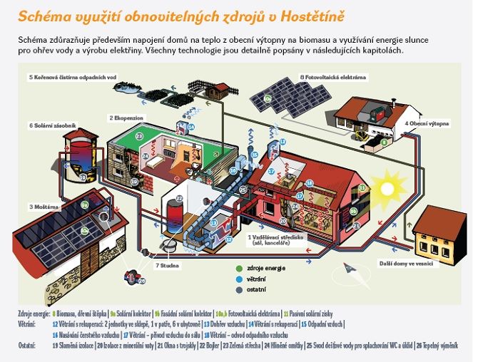 Jak kořenová čistička (tedy vlastně umělý mokřad s bahenními rostlinami) funguje? Rostliny spolu s bakteriemi žijícími ve filtračních polích čistírny zbavují vodu znečistění. Obec tak ušetřila za elektřinu a místní dlouho nemuseli platit žádné stočné. Právě úspěch kořenové čističky nastartoval boom ve využívání obnovitelných zdrojů v Hostětíně.