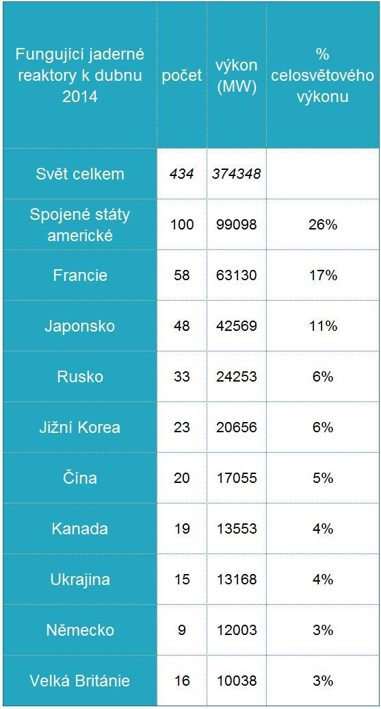 Zdroj: Světová jaderná asociace, údaje aktuální k 1. 4. 2014