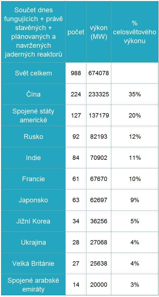 Pokud bychom nahlédli do delšího časového horizontu a sečetli všechny aktuálně provozované, rozestavěné i plánované reaktory, kterou by měly být spuštěny v příštích patnácti letech, uvidíme, že na přední příčky se derou především rychle se rozvíjející asijské ekonomiky Číny a Indie.