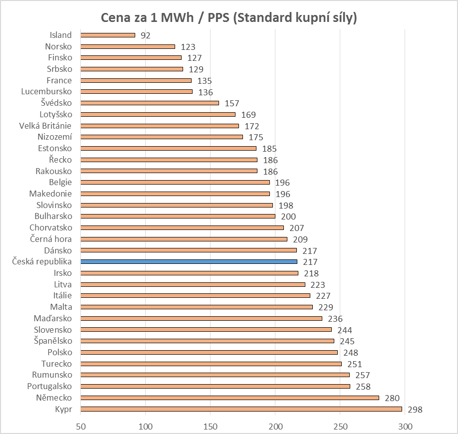 Když se nebudeme koukat na absolutní částku za spotřebovanou megawatthodinu v eurech, ale bude nás zajímat cena elektřiny podle kupní síly, zjistíme, že v České republice odebíráme nadprůměrně drahý proud. Konkrétně k nám teče 14. nejdražší elektrická energie ze 34 zkoumaných evropských zemí.