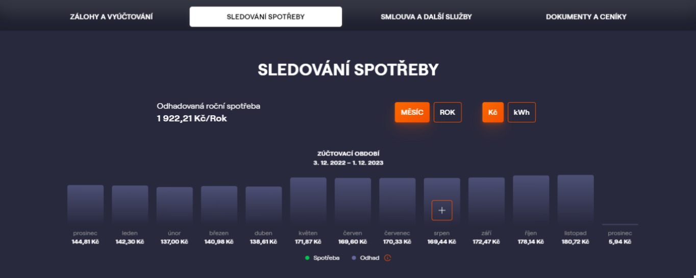 - Odhad spotřeby za probíhající období (v Kč a kWh). Pomocí pravidelného zadávání samoodečtů může uživatel odhad zpřesnit.