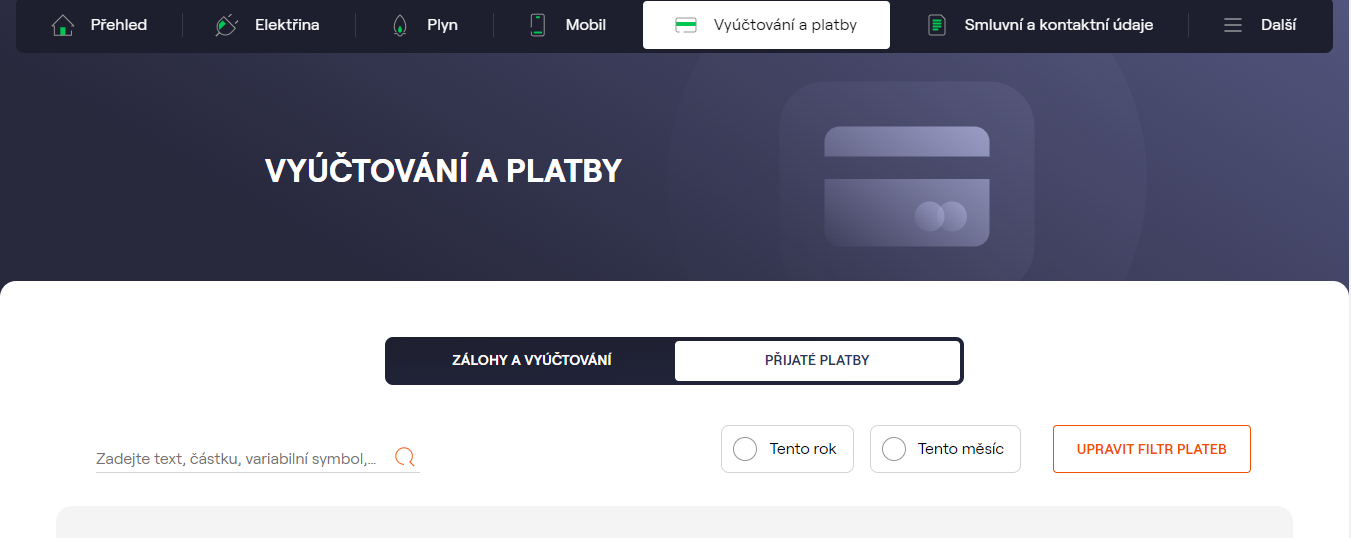 V případě, že uživatel potřebuje stáhnout doklad o zaplacení záloh, je potřeba kliknout na záložku Vyúčtování a platby. Zde je možné vybírat mezi zaplacenými a nezaplacenými částkami, nebo vyúčtováním za konkrétní období. U plateb a vyúčtování pak stačí kliknout na Detail.