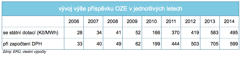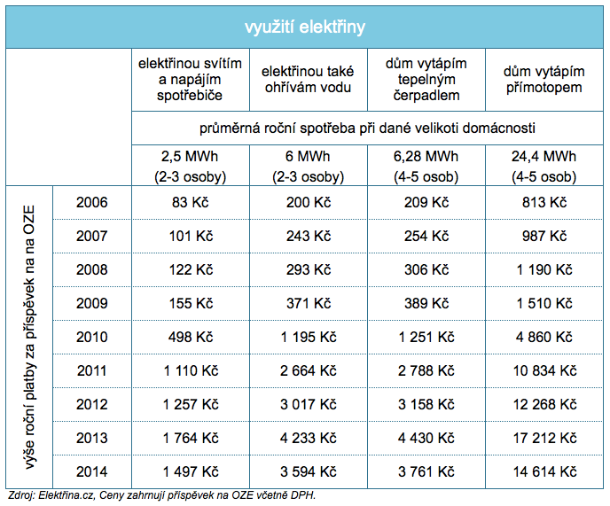 Podpora zelené energie rozhodně nepředstavuje nějakou drobnou almužnu. Klasická česká domácnost, která elektřinou ani netopí, ani neohřívá vodu, přispěje v roce 2014 na čistější životní prostředí částkou 1497 korun. V roce 2010 přitom příspěvek na OZE ukousnul jen třetinu této sumy. Nejhlouběji do peněženky sáhnou rodiny, které vytápějí ve svých domcích přímotopy. Zaplatí přibližně desetkrát tolik.