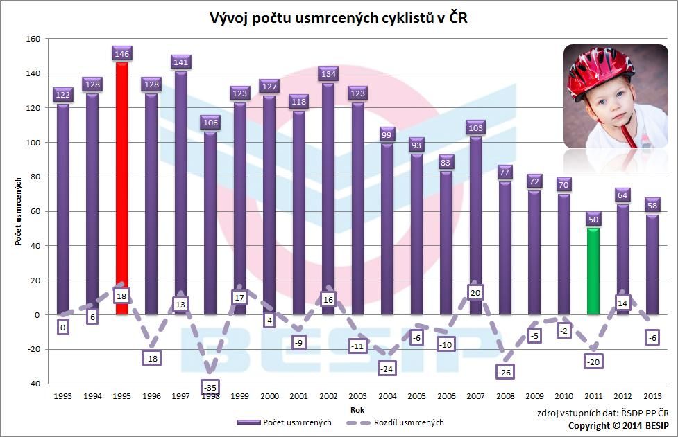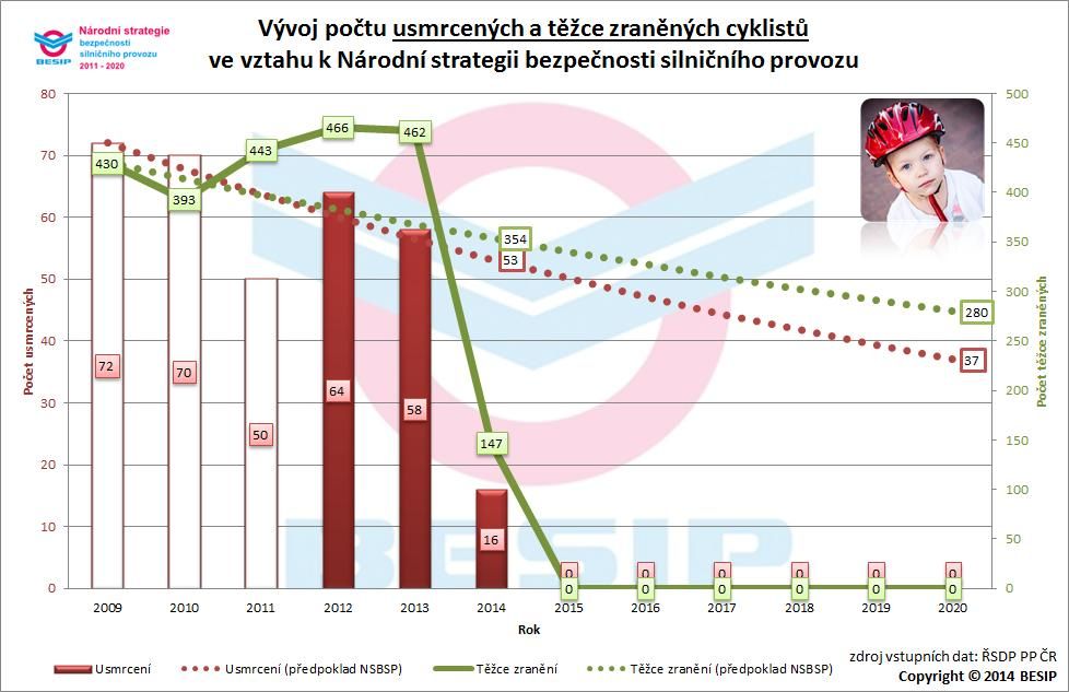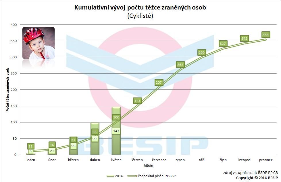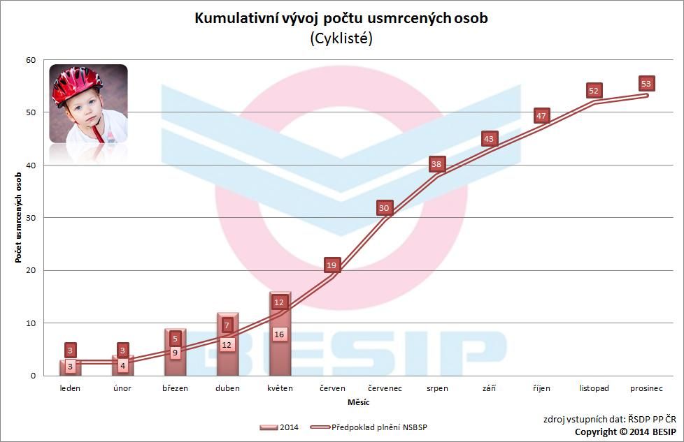 Poměrně teplý průběh zimního období a brzký začátek jara měl v tomto roce nepříznivý vliv na dílčí cíl Národní bezpečnosti silničního provozu (NSBSP) – cyklisty. V letošním roce (leden až květen) bylo usmrceno 16 cyklistů, tj. o 5 více než v loňském roce (+ 45 %)! Stanovený předpoklad plnění NSBSP je překročen o 4 usmrcené cyklisty. Velmi negativní trend tohoto roku dokresluje počet těžce zraněných cyklistů, který se prozatím zastavil na 147 osobách, tj. o 43 více než v loňském roce (+ 41 %)! Stanovený předpoklad plnění NSBSP je překročen o 47 těžce zraněných cyklistů. Žádná jiná kategorie zařazená v dílčích cílech NSBSP nevykazuje doposud tak nepříznivou bilanci.
