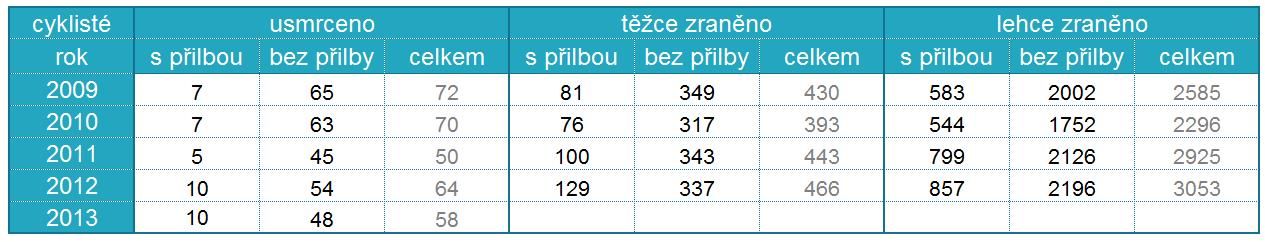 Kolik usmrcených a těžce zraněných cyklistů jelo na elektrokole statistiky neevidují. Např. v PREkolo si můžete elektrokolo zakoupit a získáte 10% slevu na nákup kompletního příslušenství – tedy i přilby! V případě výpůjčky je k dispozici celý balík příslušenství ZDARMA a přilba je uvedená hned na prvním místě - http://www.prekolo.cz/cs/prislusenstvi/.