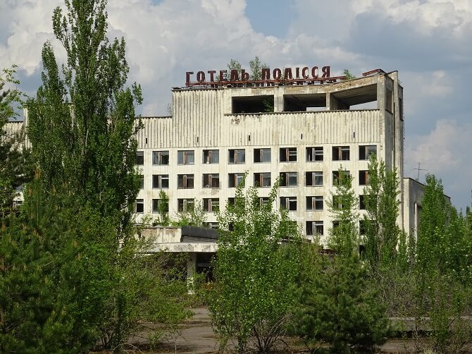 Mezi nejvyšší budovy města stále patří hotel Polesí. Kdysi sem proudili hosté, v roce 1986 se na jeho terase usídlila vyšetřovací komise Černobylské havárie, která zahájila evakuaci obyvatel až po 36 hodinách od ničivých výbuchů 4. reaktoru elektrárny. Později tu bydleli tzv. likvidátoři (skupina lidí, kteří čistili zamořenou zónu od radiace).