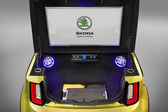 Když zvednete víko kufru, objevíte i další skryté poklady. Chytrou televizi na spodní straně víka, dva přední a dva zadní reproduktory o akustickém výkonu 400 wattů a dva nafukovací pytle na sezení. Vlastně si stále s sebou vozíte malou mobilní diskotéku.