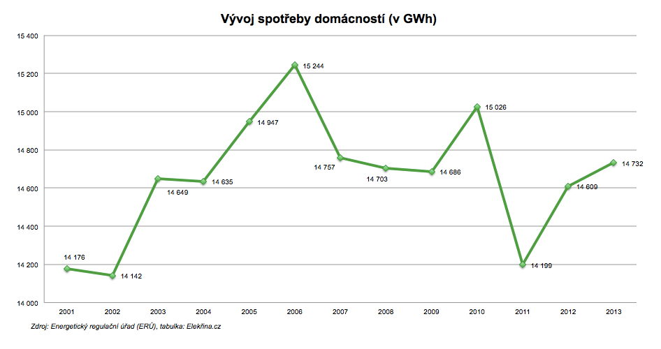 Největší výkyvy směrem nahoru v letech 2006 a 2010 ukazují na dlouhé a chladné zimy. Přelom roku 2005/2006 přinesl tak tuhou zimu, že se o ní začaly zpívat písně. Jarek Nohavica napsal tehdy velmi populární Ladovskou zimu a elektroměry domácností začaly lámat rekordy. Naopak teplotně nadprůměrné zimy v letech 2002 a 2011 sice nepotěšily moc lyžaře, ale odběratelé elektřiny díky uspořeným financím neměli důvod, proč si stěžovat.