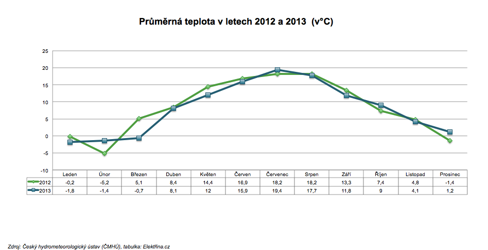 Navzdory velmi podobným květnovým a červnovým teplotám v obou letech, výrazně vyšší spotřebu elektřiny v roce 2013 mají na svědomí povodně a deštivé počasí v tomto období. Přestože dodávka elektřiny byla přerušena v oblastech postižených záplavami, po její obnově bylo nutné mokré objekty vysoušet a to přišly ke slovu různé elektrické fukary, přímotopy a ventilátory. Jjiné rodiny v propršených dnech zapínaly topení.